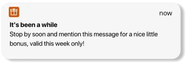 Keep your business top of mind with gentle reminders. By default, customers receive an automatic PUSH message 28 days after their last visit — encouraging them to come back. You can easily adjust the timing or the message to match your sales cycle.